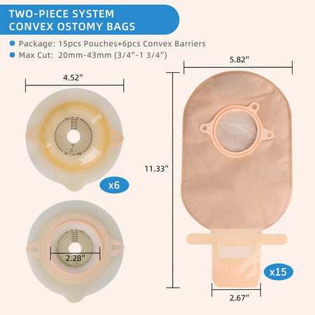 Colostomy Bags Convex Two Piece System | Ostomy Bags Ostomy Supplies Drainable Pouches with Belt Buckle | 15pcs Pouches + 6pcs Convex Barriers